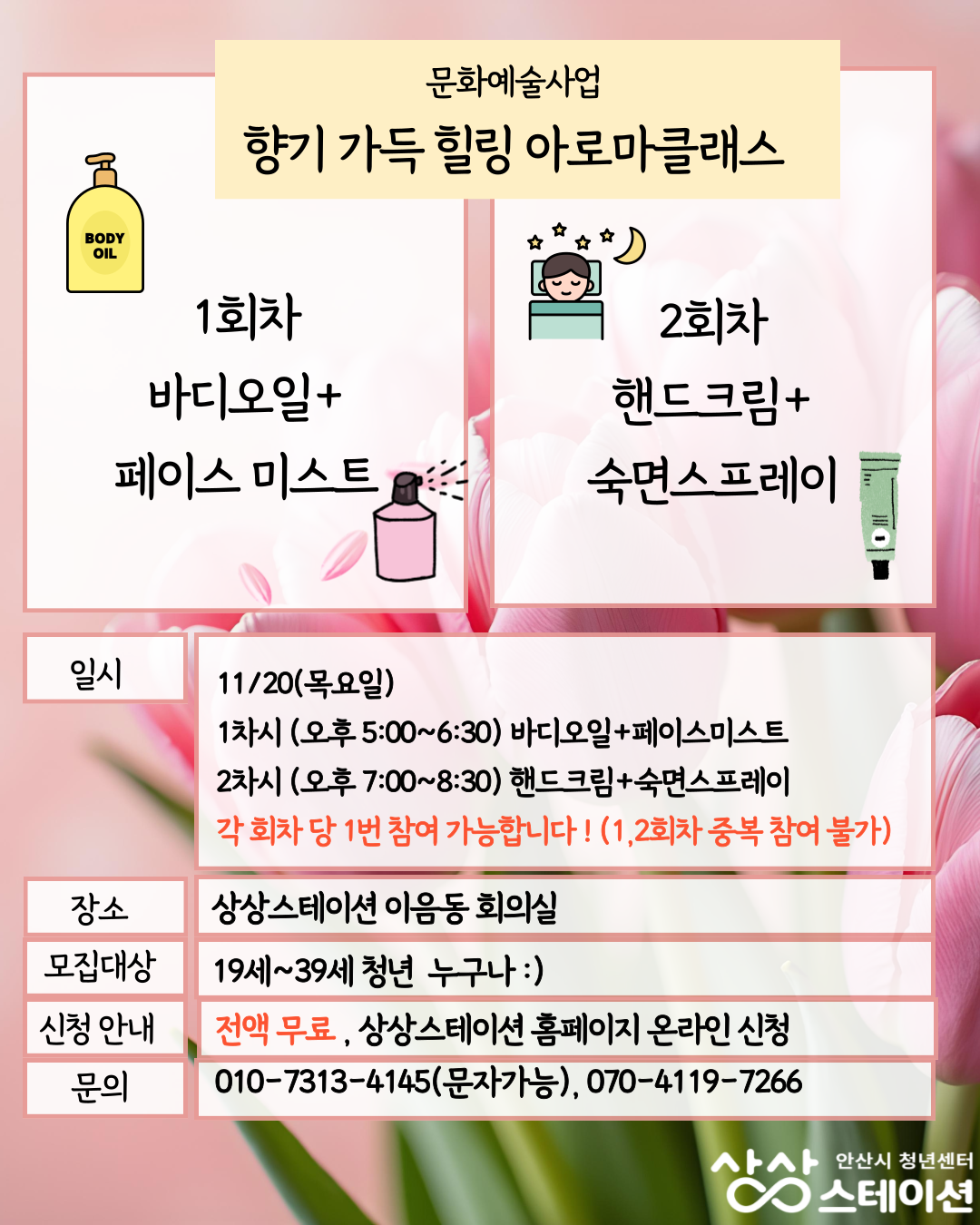 2회차(오후7시~8시30분) 핸드크림+숙면스프레이 (정원이 10명이라 11번 신청자분 부터는 대기자입니다!)