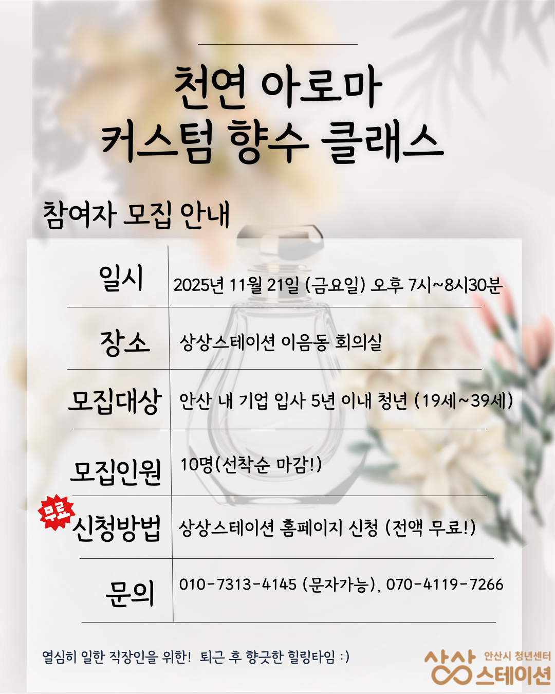 안산 내 기업 입사 5년 이내 일하는 청년을 위한 커스텀 향수 클래스입니다 :)