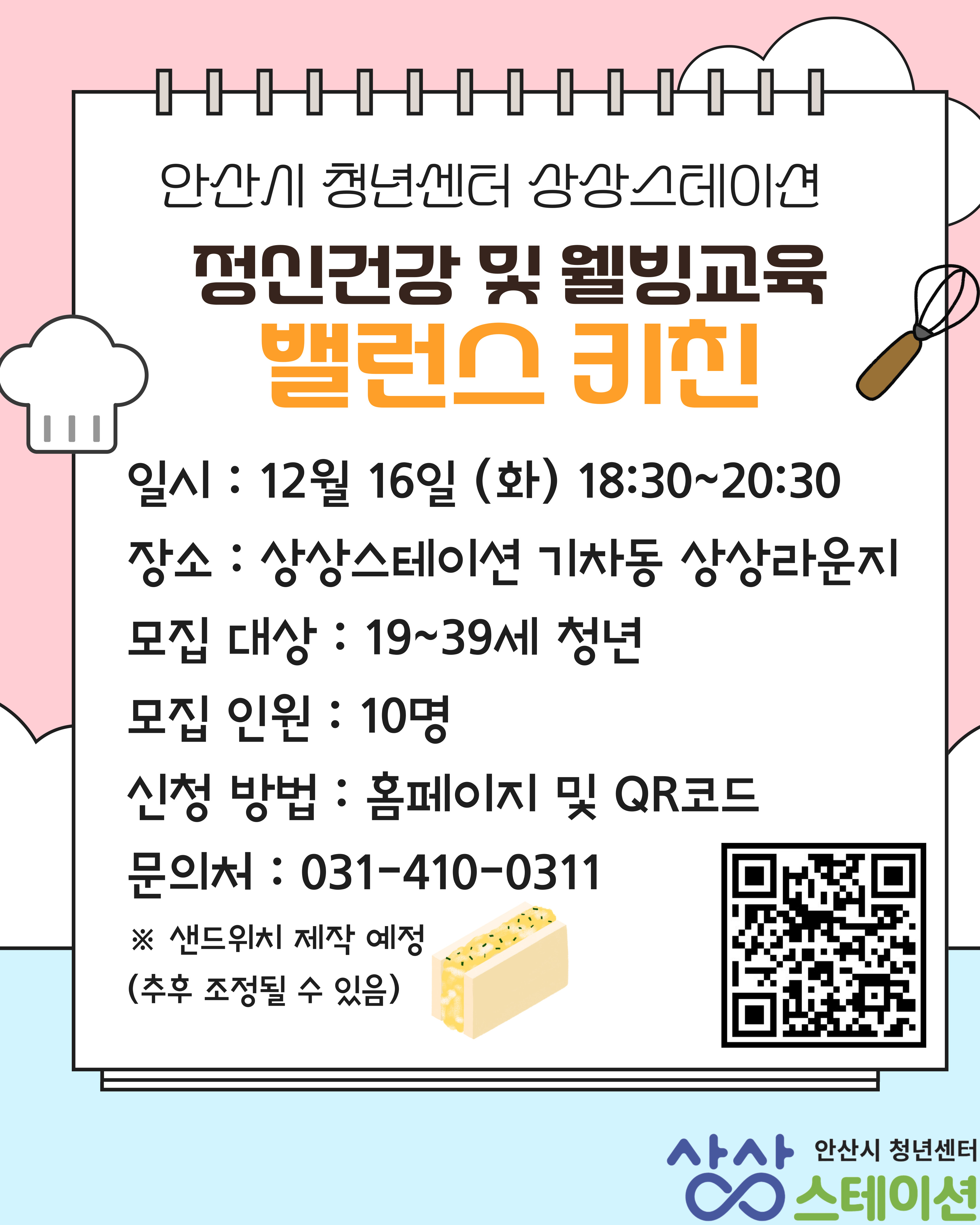 12월 16일(화) 오후 6시 30분 ~ 8시 30분 밸런스 키친 진행합니다 :) (정원은 10명이며, 11번째 신청자분들 부터는 취소자리 발생시에만 연락드리겠습니다!)