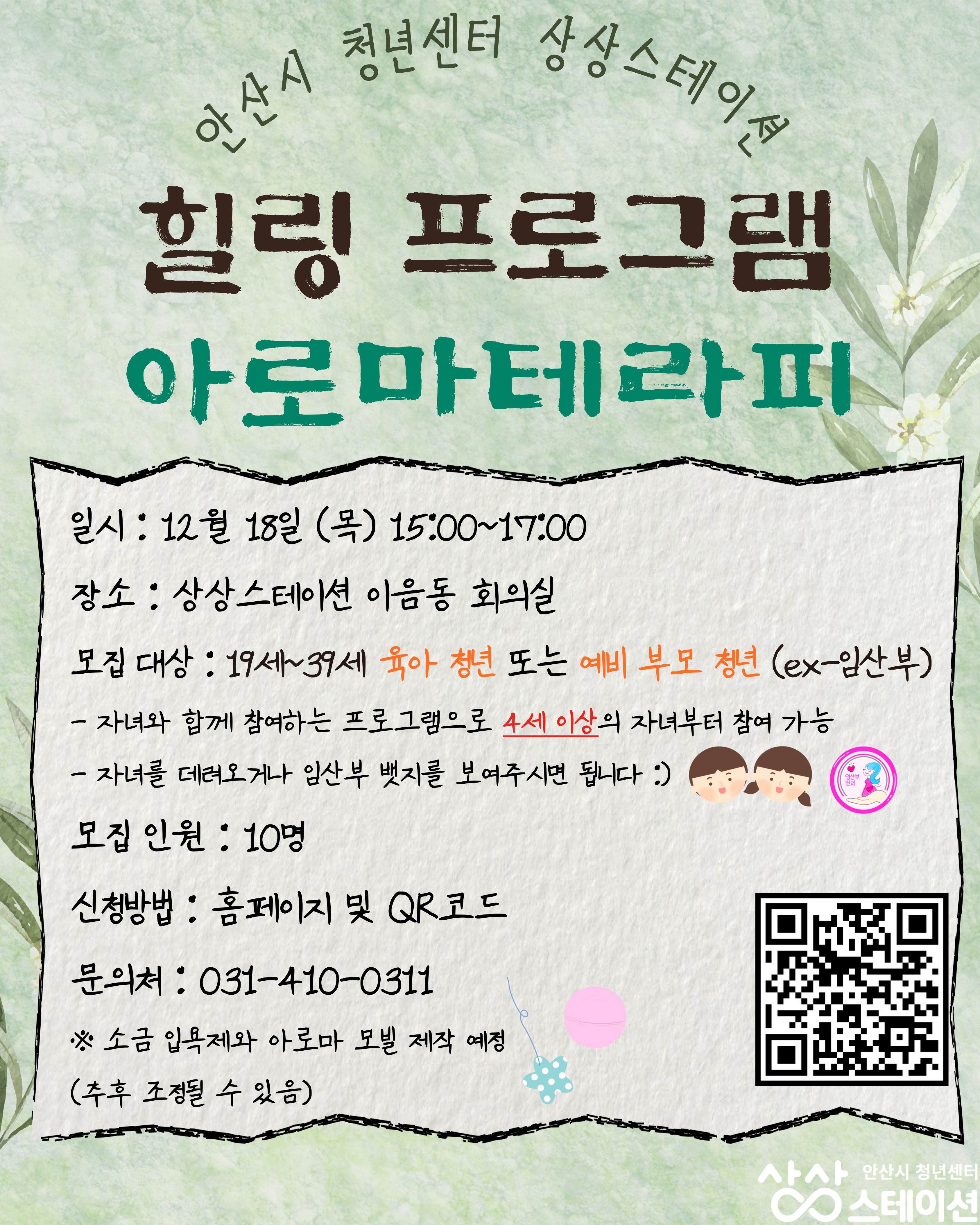12월 18일(목) 오후 3시~ 5시 아로마 테라피를 진행합니다 :) (정원은 10명이며, 11번째 신청자분들 부터는 취소자리 발생시에만 연락드리겠습니다!)