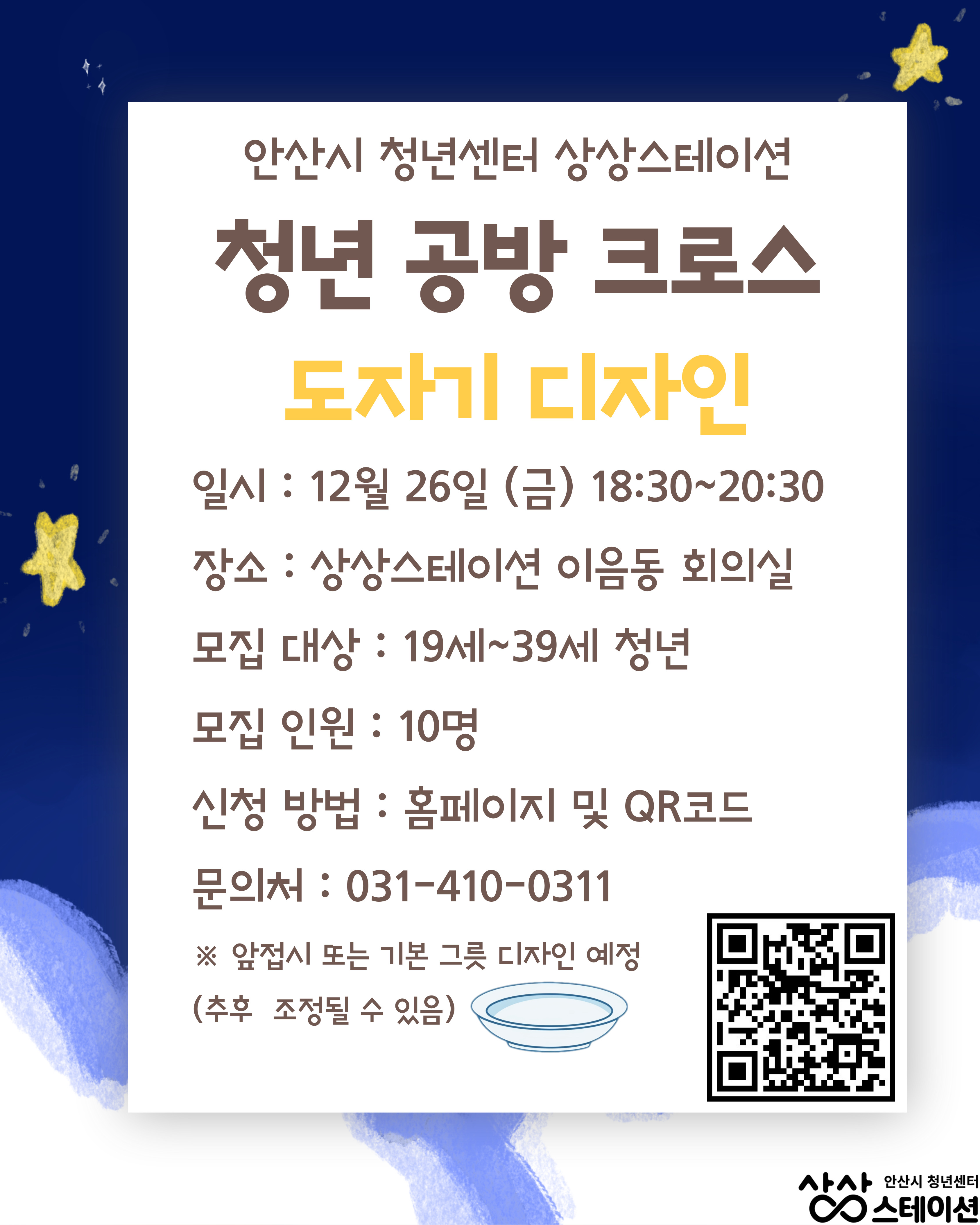 12월 26일(금) 오후 6시 30분 ~ 8시 30분 도자기 디자인 프로그램을 진행합니다 :) (정원은 10명이며, 11번째 신청자분들 부터는 취소자리 발생시에만 연락드리겠습니다!)