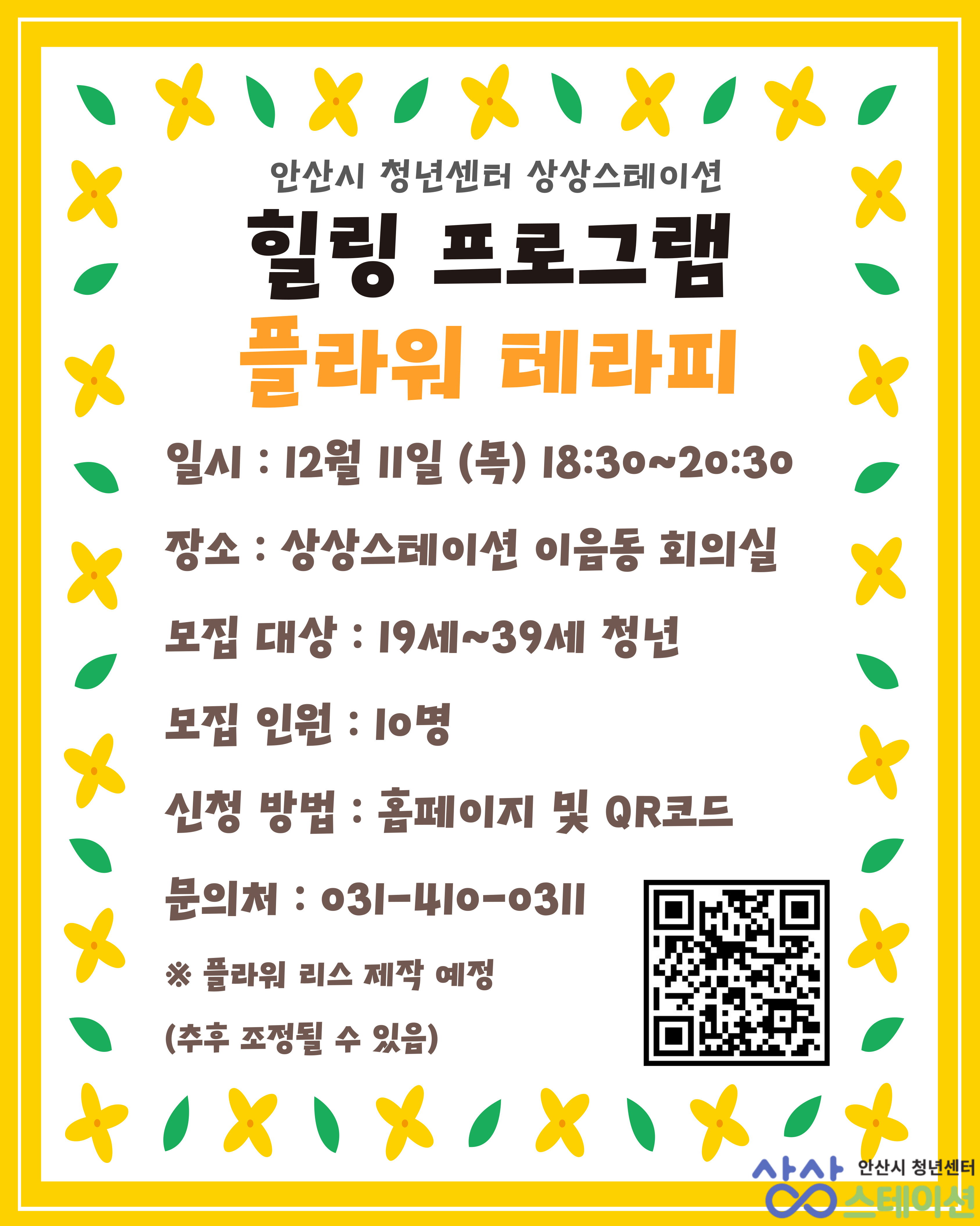 12월 11일(목) 오후 6시 30분 ~ 8시 30분 플라워 테라피를 진행합니다 :) (정원은 10명이며, 11번째 신청자분들 부터는 취소자리 발생시에만 연락드리겠습니다!)