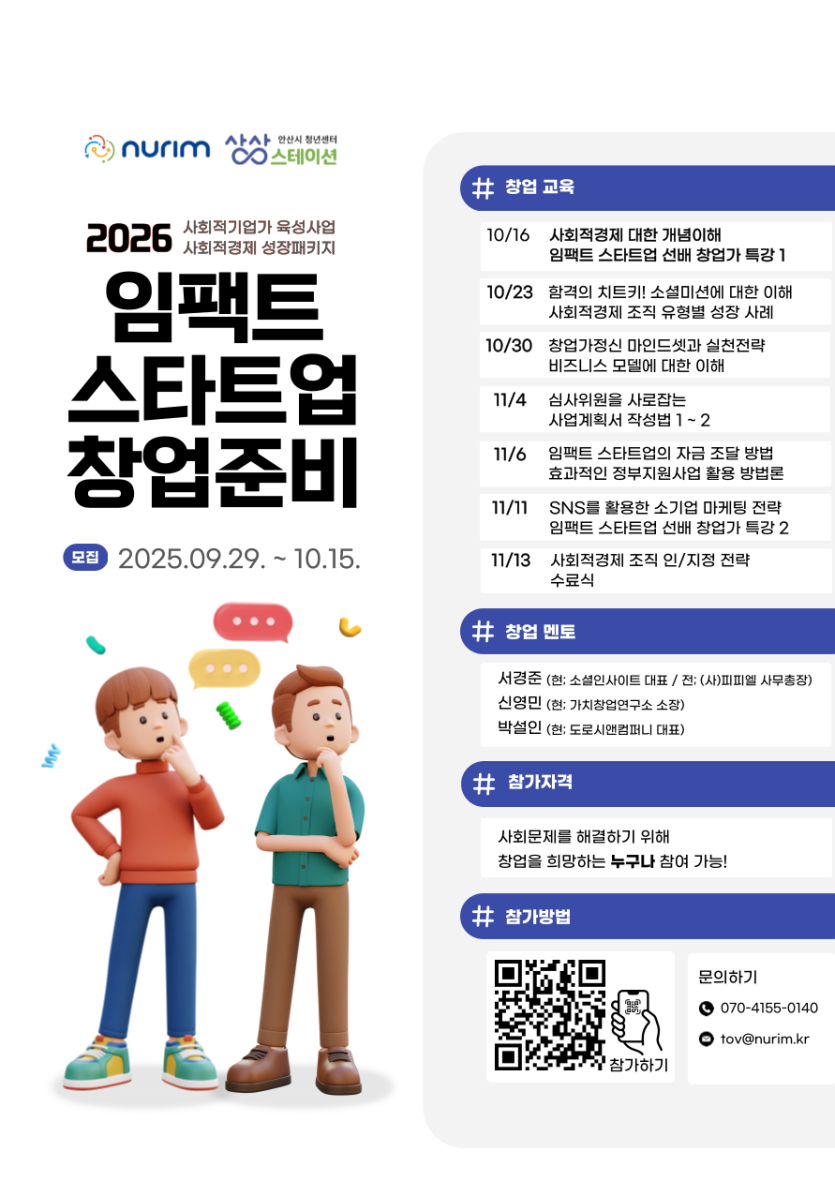 (사)가치있는누림이 주최하는 「2026 임팩트 스타트업 창업준비」 과정은 임팩트 스타트업(소셜벤처, 사회적기업) 창업을 꿈꾸는 청년들을 위한 창업 지원 프로그램입니다.