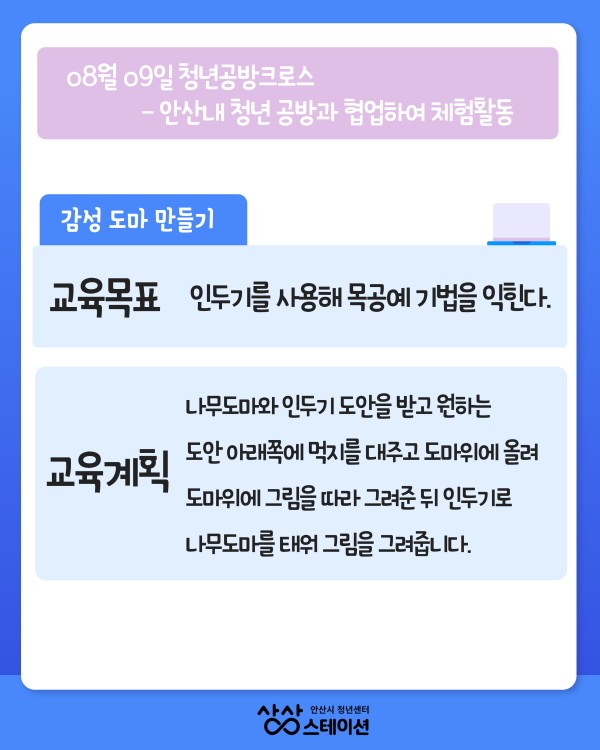 청년들의 창의성 및 예술 감각 향상, 커뮤니케이션 지원, 이색 체험 등을 경험할 수 있도록 하였습니다.